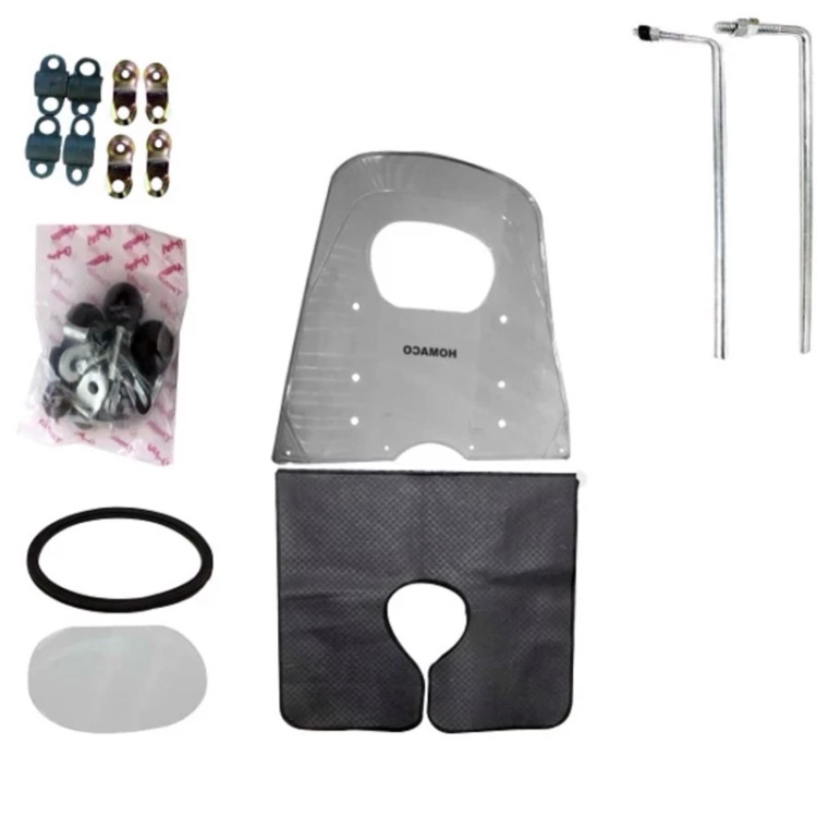 شامل : طلق 3میل درجه یک، نوار دور شیشه، شیشه، میل طلق پلیسی(بلند)، لوازم طلق(پیچ و مهره)، بست روی فرمان، دامن چرمی